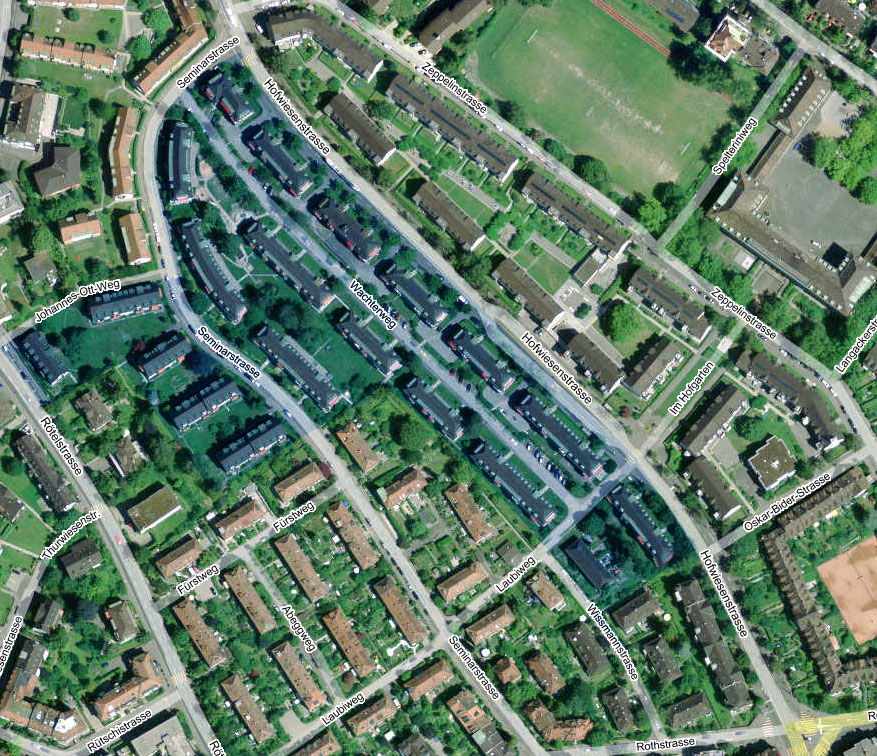 Die parallel angeordneten Häuserreihen an der Hofwiesenstrasse, am Wachterweg und an der Seminarstrasse erlauben dank der Hanglage und der vom Durchgangsverkehr kaum berührten, grosszügigen Flächen zwischen den Häusern ein ruhiges und kinderfreundliches Wohnen, genau zwischen Hauptbahnhof und Zentrum Oerlikon gelegen.